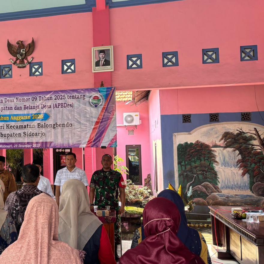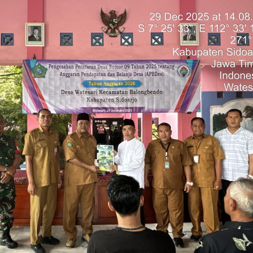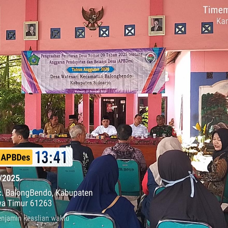 Perencanaan pembangunan desa merupakan fondasi utama dalam mewujudkan kesejahteraan masyarakat secara berkelanjutan. Desa Watesari, Kecamatan Balongbendo, Kabupaten Sidoarjo, sebagai bagian dari sistem pemerintahan daerah, terus berkomitmen untuk melaksanakan pembangunan yang partisipatif, transparan, dan akuntabel. Tahun Anggaran (TA) 2026 menjadi momentum penting bagi Desa Watesari untuk melanjutkan dan menyempurnakan berbagai program prioritas yang berorientasi pada peningkatan kualitas hidup masyarakat.Proses pembangunan Desa Watesari TA 2026 diawali dengan pengesahan Anggaran Pendapatan dan Belanja Desa (APBDes). Pengesahan APBDes menjadi dasar hukum sekaligus pedoman pelaksanaan seluruh kegiatan dan pembangunan desa selama satu tahun anggaran.Pengesahan APBDes Desa Watesari TA 2026