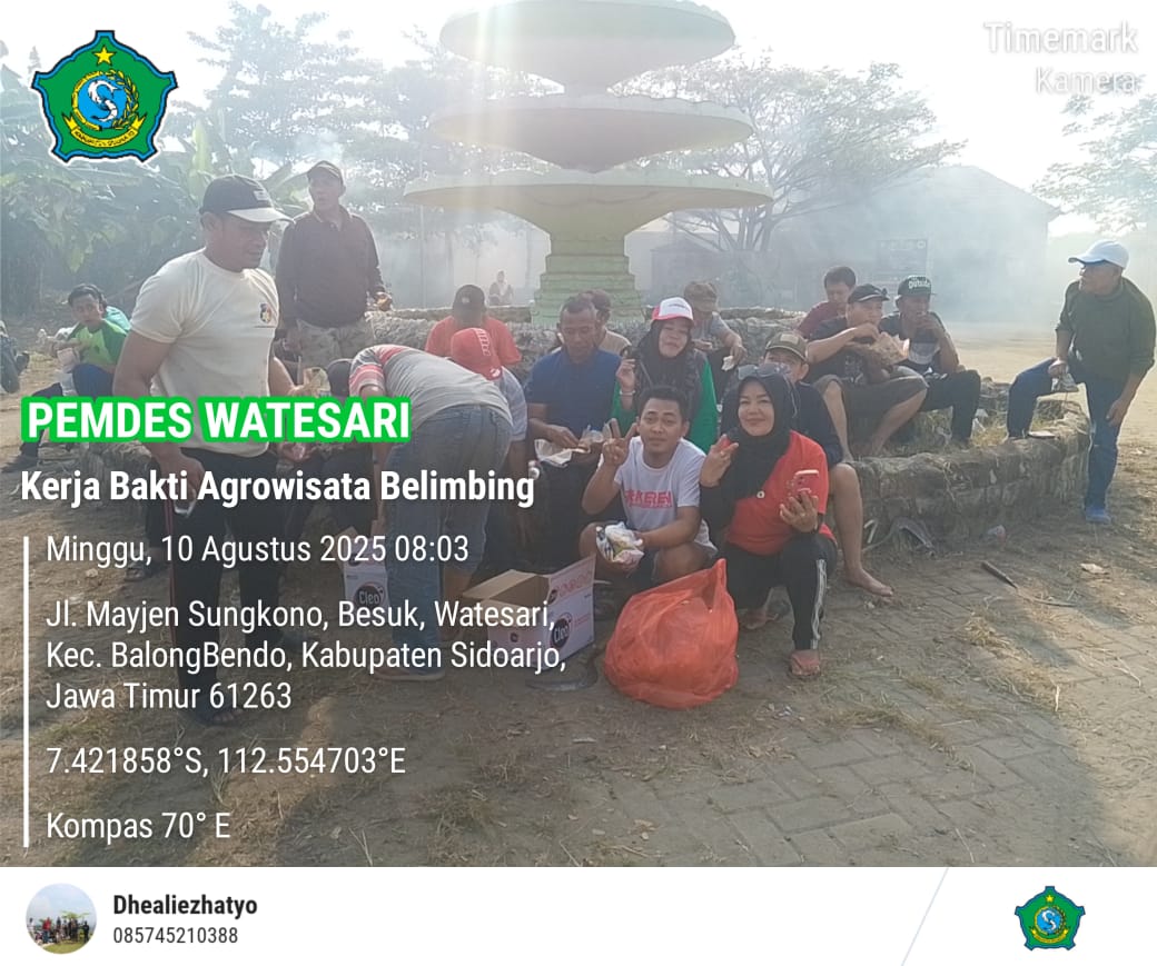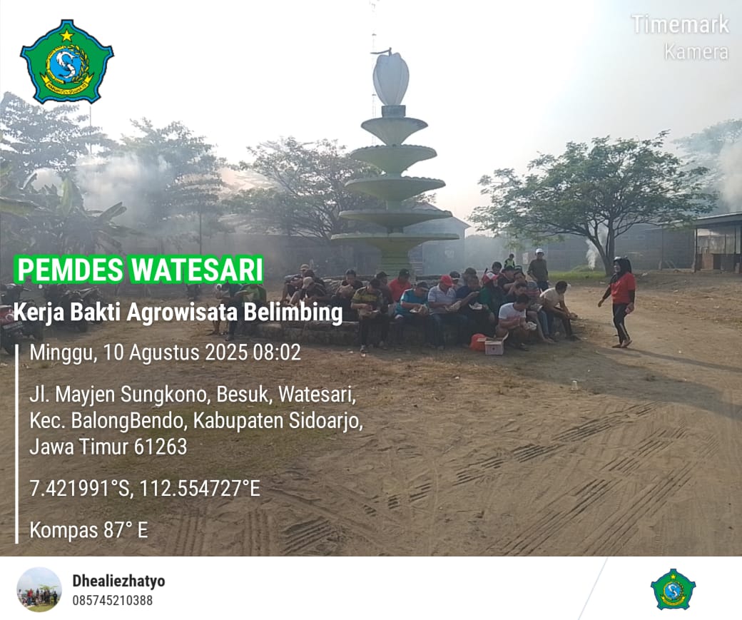 Desa Watesari, Kecamatan Balongbendo, Kabupaten Sidoarjo - Pada hari minggu 10 Agustus 2025, Seluruh Perangkat Desa Watesari, Lembaga Desa, BPD, RT, RW, LPM, KARTAR, TOMAS, TOGA, dan Ibu PKK berkumpul untuk melakukan kerja bakti pembersihan lahan Agrowisata Belimbing. Kegiatan ini merupakan upaya gotong royong untuk meningkatkan kebersihan dan keindahan desa, serta mempromosikan potensi agrowisata di Desa Watesari.