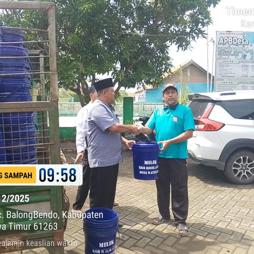 Desa Watesari, Kecamatan Balongbendo, Kabupaten Sidoarjo - Kelompok Swadaya Masyarakat (KSM) Resik Jaya Desa Watesari membagikan tong sampah kepada seluruh warga desa yang menjadi anggota. Acara penyerahan tong sampah ini dilakukan secara simbolis oleh Bapak Aminudin, Ketua KSM Resik Jaya, kepada Bapak Arofik Selaku Kepala Desa Watesari.